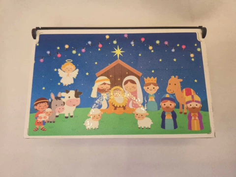 Dentro dela, os pequenos encontram peças coloridas e fáceis de encaixar, que transformam a história do nascimento de Jesus em uma experiência interativa e encantadora.