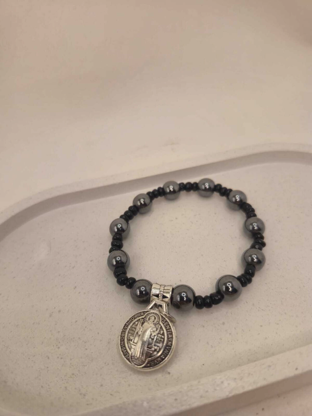 Feita com contas de hematita polidas, conhecidas por suas propriedades energéticas que ajudam a equilibrar as emoções e afastar energias negativas, essa pulseira é um verdadeiro amuleto de proteção. O destaque fica por conta do pingente de São Bento, símbolo poderoso de fé e defesa espiritual, que torna o acessório ainda mais especial.